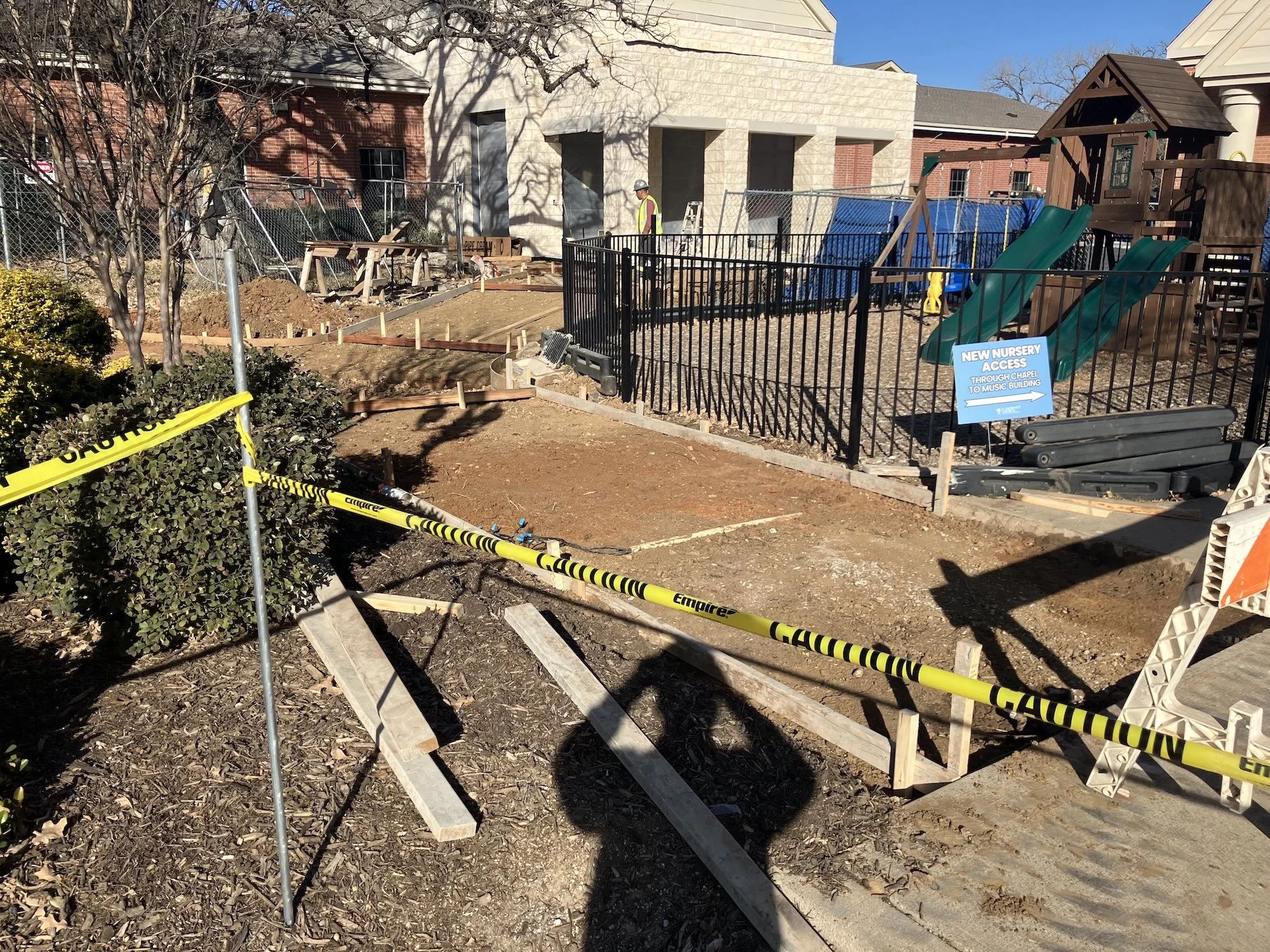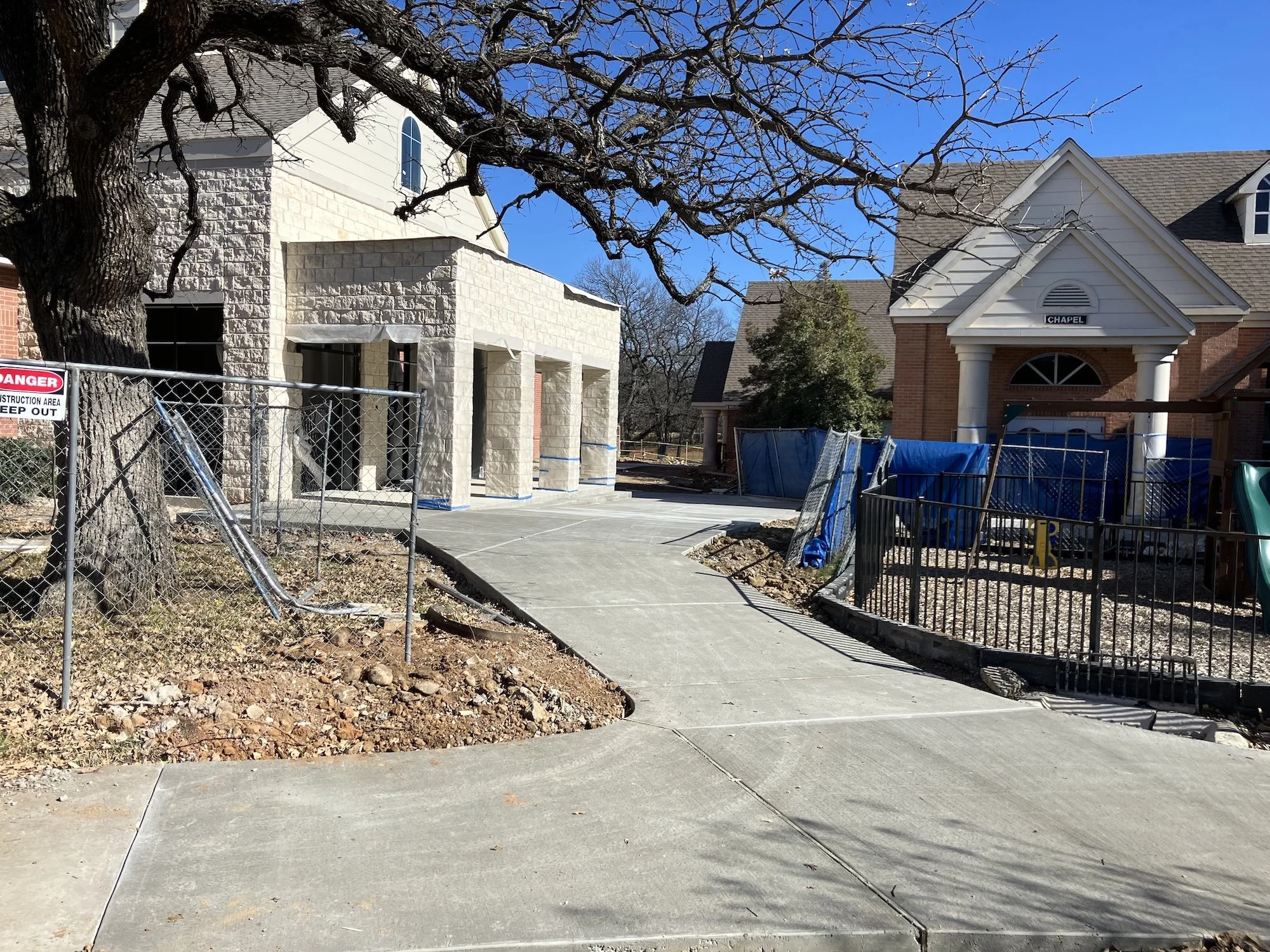 The new sidewalk has been poured between the Church, Chapel, Music Building and Children’s Ministry Building. The walkway to the Chapel and Music Building has reopened.