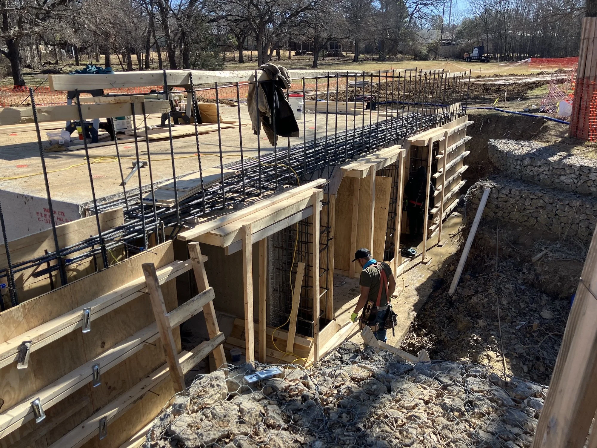 Concrete box culverts have all been placed for the vehicle bridge and concrete forms are being constructed to complete the roadway from the bridge to the back parking lot.
