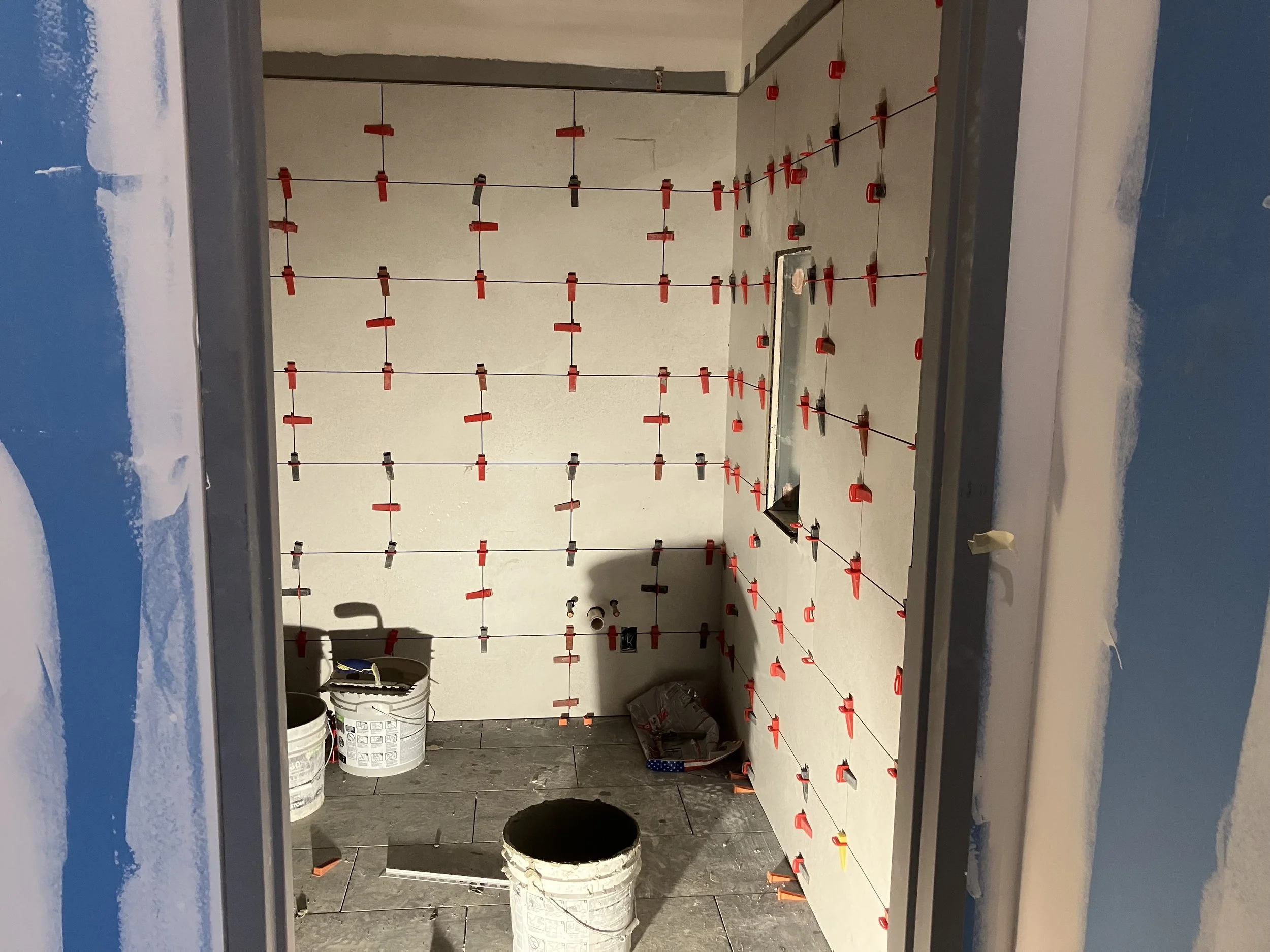 In the Children’s Ministry Building, bathroom tile work has begun and drywall tape and bedding continues.