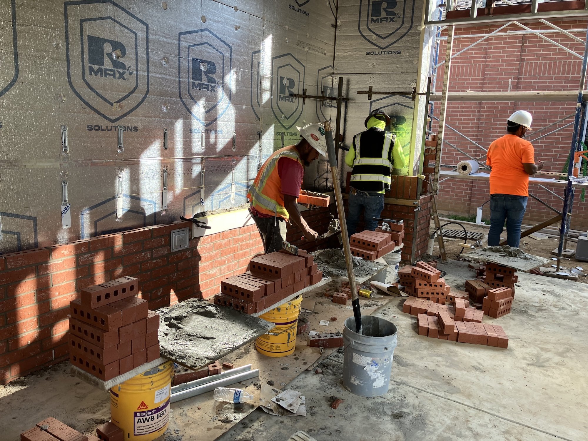 Red brick masonry work has begun on both buildings.