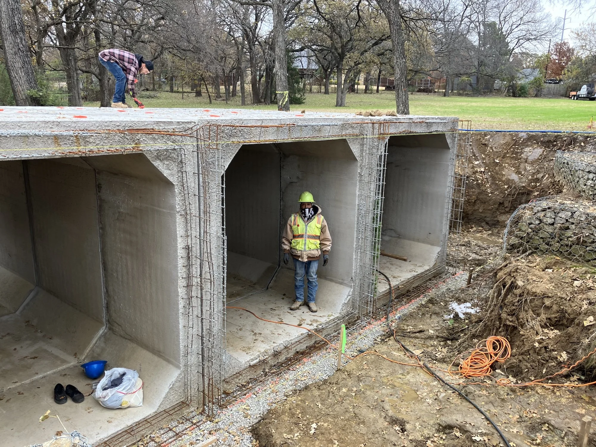Work began on construction of the vehicle bridge over the creek. 12 massive concrete culvert boxes have been installed.