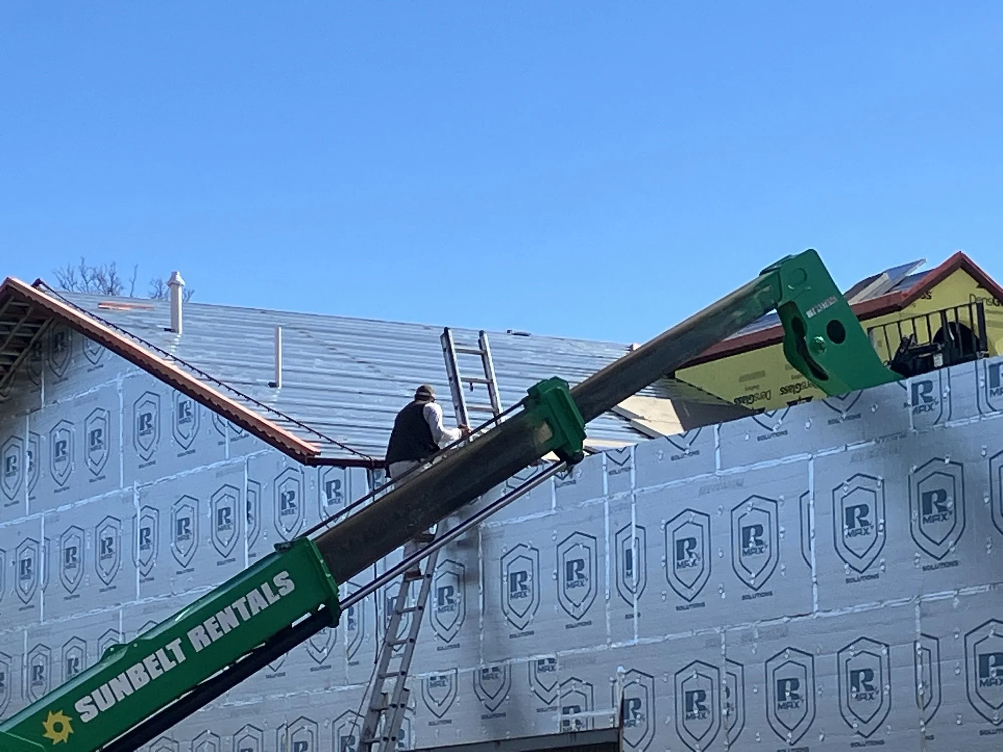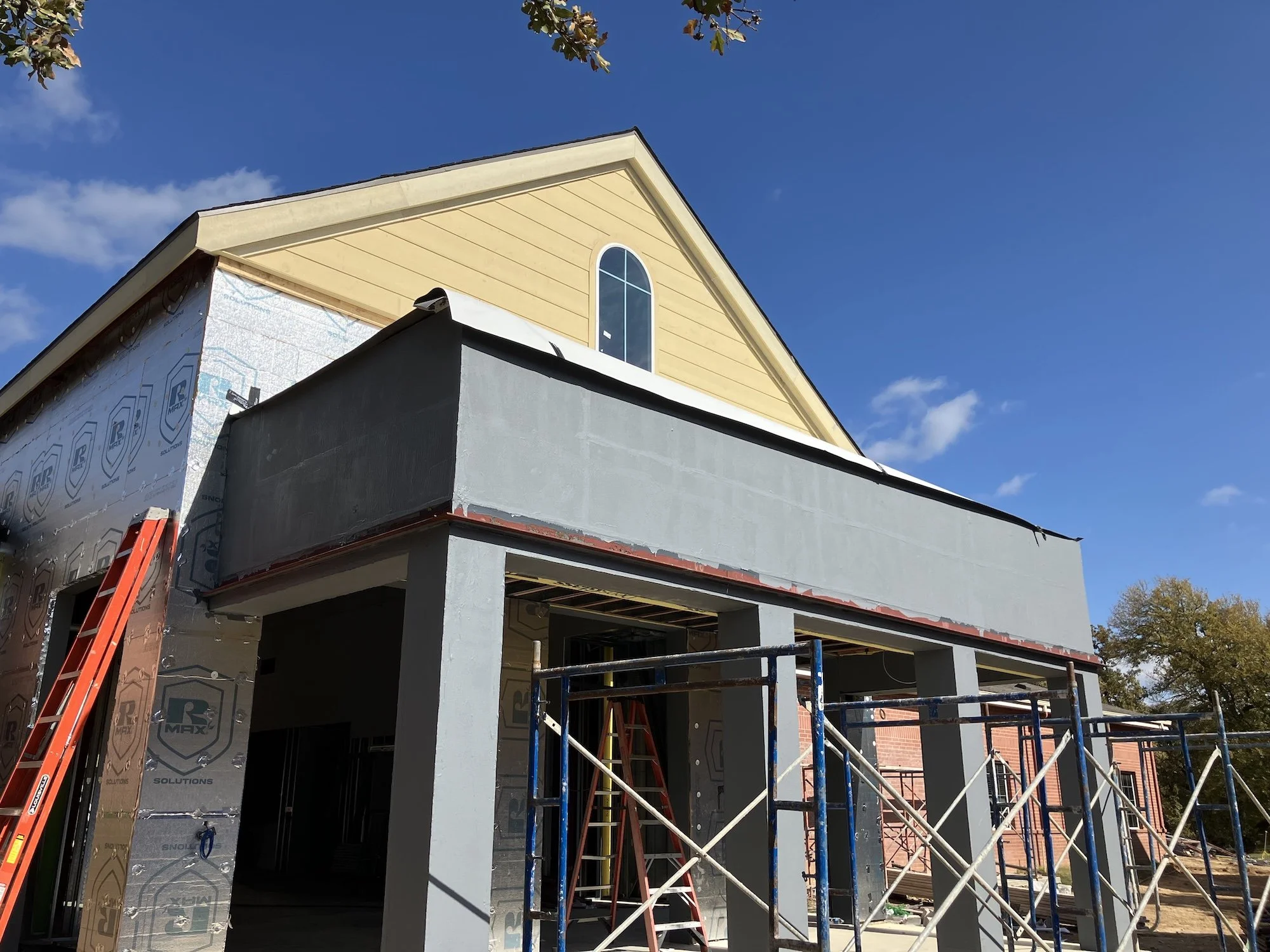 We are continuing to work with the external sheathing (the silver stuff, for those of us who don’t spend their weekends at Home Depot) on the Children’s Ministry Building. This is part of the dry-in process so that the interior drywall and finish out can be completed. Work began on the exterior trim.