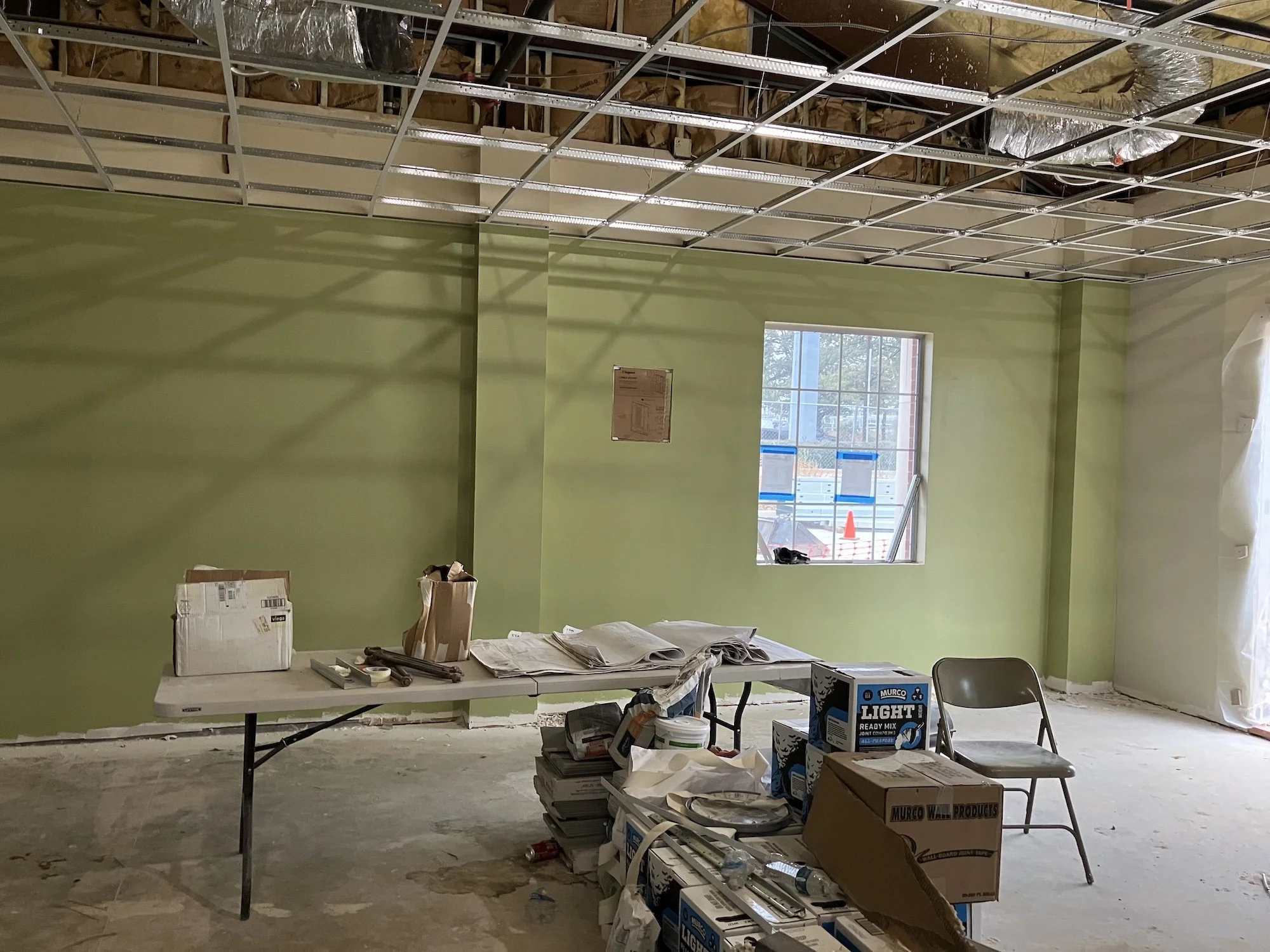 Now that the roof is completed on the Children’s Ministry Building, the drywall inside is now being installed.