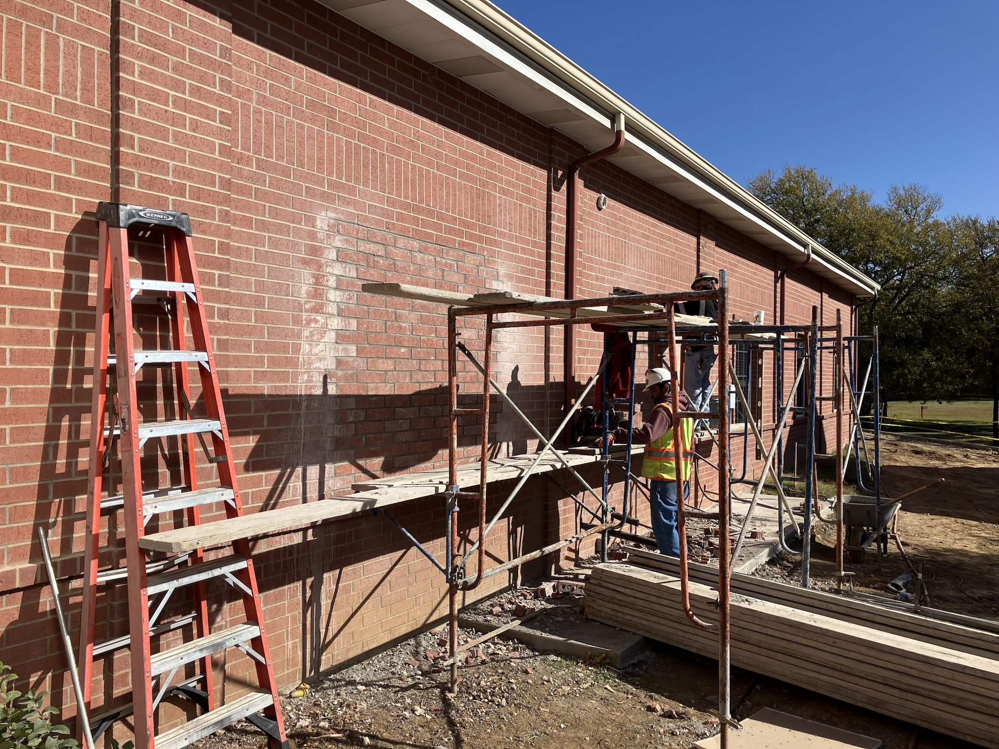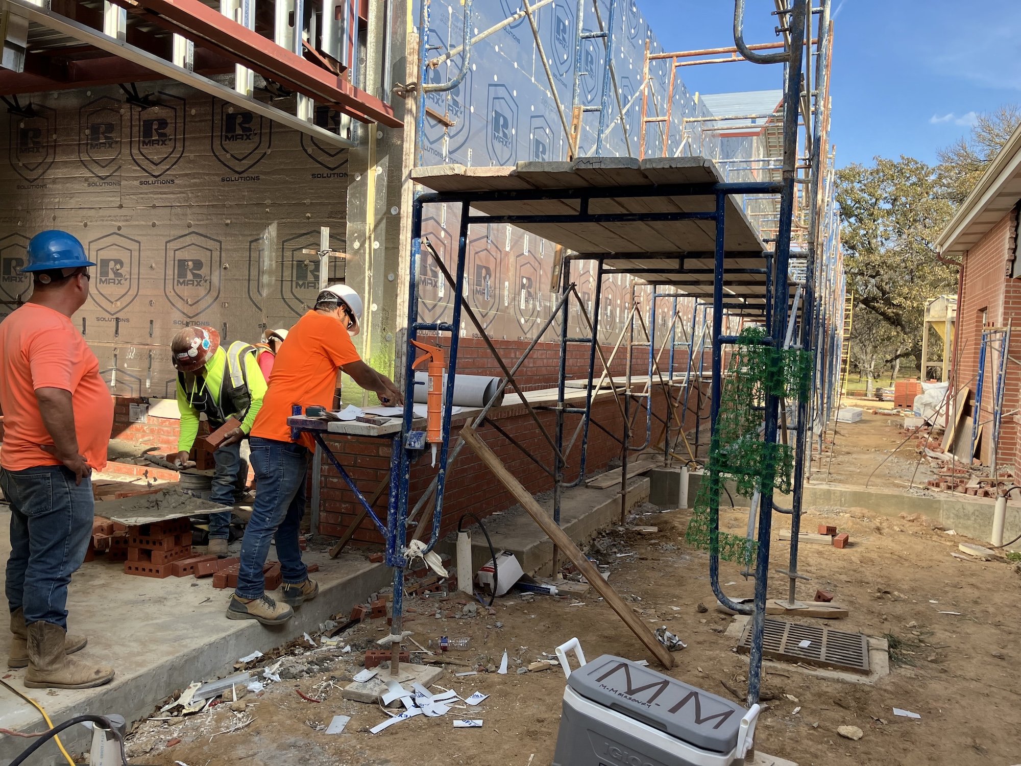 We are continuing work on the exterior sheathing on The Great Hall. Exterior red brick work has begun and will continue for the next week. Soffit framing has begun.